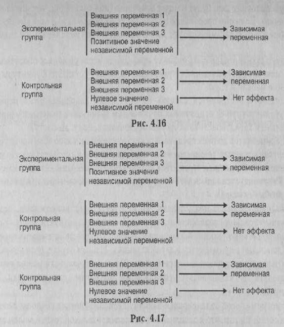 Рассмотрим способ балансировки влияния неспецифических внешних переменных. Он состоит в том, что в дополнение к экспериментальной группе в план эксперимента включается контрольная группа. Экспериментальное исследование контрольной группы проводится в тех же условиях, что и исследование экспериментальной. Отличие в том, что экспериментальное воздействие осуществляется только на испытуемых, включенных в экспериментальную группу. Тем самым изменение зависимой переменной в контрольной группе обусловлено лишь внешними переменными, а в экспериментальной — совместным действием внешних и независимой переменных.