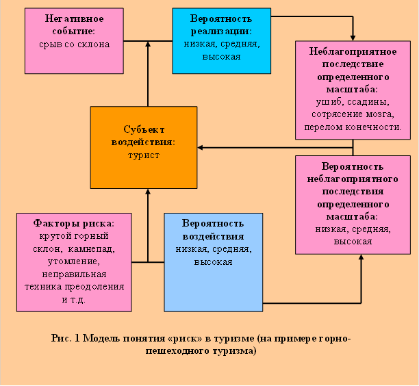 Что означает понятие «риск» в приложении к туризму? Для нас в данной теме, прежде всего, важна безопасность туристской деятельности для человека, как такового. В данном контексте наиболее значимыми неблагоприятными последствиями воздействия факторов риска в активном туризме следует считать несчастные случаи с туристами и заболевания туристов в походных условиях. По определению Ю.А. Штюрмера (1983), несчастный случай это – «Непреднамеренная травма или смерть человека, происшедшие в результате неожиданного травмирующего воздействия в условиях активного туристского путешествия». В этом определении заложено и понятие масштаба неблагоприятных последствий: от мелких ссадин, потертостей на конечностях, насморка, до летального исхода. Тогда риск туристской деятельности, в узком смысле мы можем определить как вероятность несчастного случая (аварии) или заболевания участников туристских мероприятий вследствие воздействия на них факторов риска. При этом мы сознательно сужаем рамки понятия риска в туристской деятельности, ограничиваясь лишь негативными воздействиями на самих участников этой деятельности (не рассматриваем негативные воздействия на предметы снаряжения, элементы инфраструктуры (кемпинги, турбазы и пр.), финансовые ресурсы и т.д.).