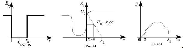 – частиц будет положительной. Таким образом, имеет место быть некоторая потенциальная яма (см. рис. 45). Здесь даны следующие приближения: стенки потенциальной ямы имеют строго вертикальный вид. На самом же деле края ямы несколько более пологи, но в нашем рассмотрении это не играет никакой роли. В классическом рассмотрении