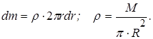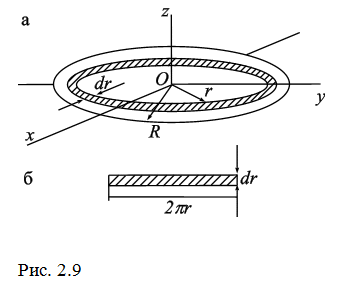 Разобьем диск на концентрические полосы шириной dr (рис. 2.9, б). За элемент массы dm возьмем массу кольца толщиной dr. Такой выбор элемента массы объясняется тем, что расстояния от всех точек до центра диска одинаковы и равны r (радиальная симметрия). Элемент массы dm равен ее площади , умноженной на плотность  (А - площадь диска).
