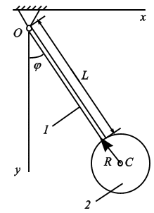 Пример. Физический маятник, изображенный на рис. 2.11, состоит из тонкого однородного стержня длиной L и массой  и круглого однородного диска радиусом R и массой . Определить момент инерции  маятника, относительно оси его вращения Оz (ось Оz направлена перпендикулярно к плоскости рисунка).