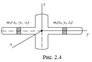 Рассмотрим однородное тело, имеющее ось симметрии. Проведем координатные оси oxyz так, чтобы ось оz была направлена вдоль оси симметрии (рис. 2.4). В силу симметрии каждой точке тела с массой  и координатами  будет соответствовать точка с другим индексом, но с такой же массой и с координатами, равными . В результате получим, что  (слагаемые попарно одинаковы по модулю и противоположны по знаку); отсюда, учитывая (2.12), находим, что
