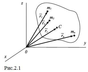 Если механическая система состоит из конечного числа материальных точек N с массами , радиус-векторы которых проведены из одной и той же точки О –  (рис. 2.1), то центром масс называется геометрическая точка С, радиус-вектор которой  определяется выражением
