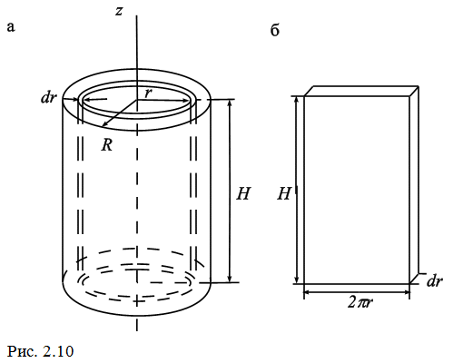 За элемент массы dm возьмем массу этой трубки. Объем трубки равен (рис. 2.10, б), а ее масса ,  - плотность. Объем всего цилиндра . Следовательно,