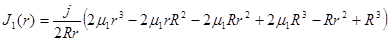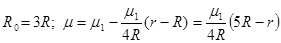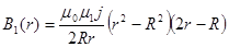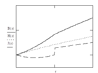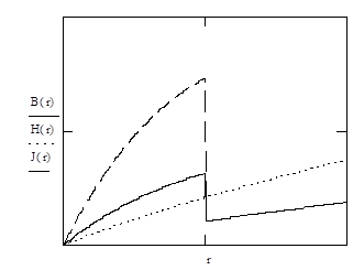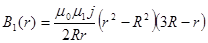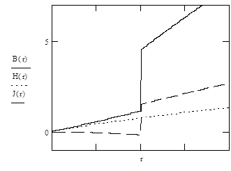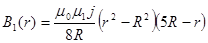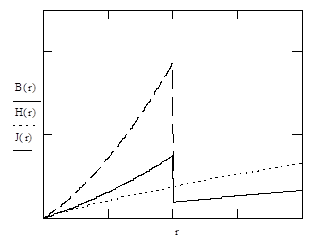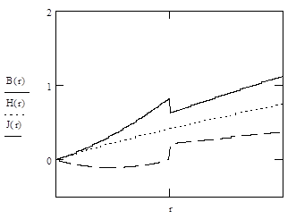 Проводник с током, равномерно распределённым по его поперечному сечению и имеющему плотность j, имеет форму трубки, внешний и внутренний радиусы которой равны R0 и R соответственно. Величина магнитной проницаемости проводника меняется по линейному закону от значения m1 до m2 в интервале радиусов от R до R1 и m3=const в интервале радиусов от R1 до R0 (R1=(R0+R)/2). Построить графически распределения модулей векторов индукции магнитного поля B и напряжённости магнитного поля H, а также вектора намагниченности J в зависимости от r в интервале от R до R0. Определить поверхностную плотность токов намагничивания i'п на внутренней и внешней поверхностях трубки и распределение объёмной плотности токов намагничивания i'об(r).
