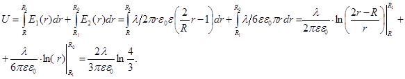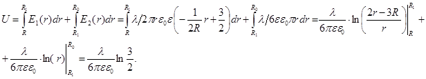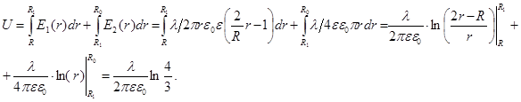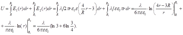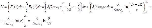 Цилиндрический бесконечно длинный диэлектрический конденсатор заряжен до разности потенциалов U и имеет радиусы внешней и внутренней обкладок R0 и R соответственно. Величина диэлектрической проницаемости между обкладками меняется по линейному закону от значения ε1 до ε2 в интервале радиусов от R до R1, и ε3=сonst в интервале радиусов R1 до R0. Построить графически распределение модулей векторов электрического поля E, поляризованности Р и электрического смещения D между обкладками конденсатора. Определить поверхностную плотность зарядов на внутренней и внешней поверхностях диэлектриков, распределение объёмной плотности связанных зарядов ρ’(r), максимальную напряжённость электрического поля Е и ёмкость конденсатора на единицу длины.
