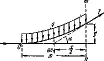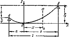 Начало координат выберем в самой низшей точке провисания нити О, положение которой, нам пока неизвестное, очевидно, зависит от величины нагрузки q, от соотношения между длиной нити по кривой и длиной пролета, а также от относительного положения опорных точек. В точке О касательная к кривой провисания нити, очевидно, горизонтальна. По этой касательной направим вправо ось