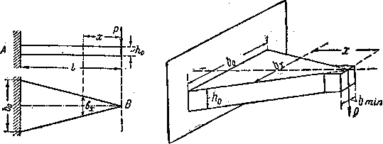 Покажем ход вычислений на примере. Рассмотрим балку пролетом l, защемленную концом А и нагруженную на другом конце силой Р (Рис.1). Выберем сечение этой балки в виде прямоугольника; задачу о надлежащем изменении момента сопротивления можно решать, меняя высоту или ширину балки или тот и другой размер вместе.