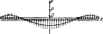 Разрезав балку сечением в точке О справа от силы Р и рассматривая правую часть балки, видим, что поперечная сита в этом сечении равна реакции основания, действующей на правую половину балки со знаком минус; так как реакция направлена вверх (для правой половины) и вся реакция основания равна Р, значит, поперечная сила в сечении при х = 0 равна