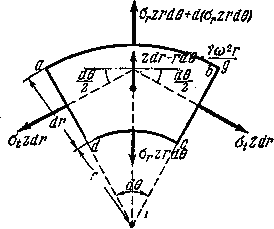 Переменную толщину диска, являющуюся некоторой функцией радиуса r, обозначим через z. На элемент abcd по меридиональным сечениям ad и bc действуют две силы