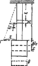 Предположим, что при колебаниях перемещения всех сечений стержня по отношению к закрепленному концу меняются по тому же закону, что и при статическом растяжении, т. е. пропорционально расстоянию от закрепленного сечения. Таким образом, если нижнее сечение стержня переместилось на величину х, то сечение, отстоящее от места защемления на