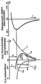 Рис. 16. Изменение потенциальной энергии взаимодействия между атомами:
