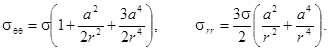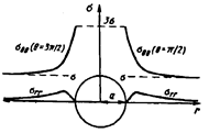 Основным модельным представлением в механике разрушения является пластина с нарушением сплошности, представляющим собой разрез (трещину) и являющимся концентратором напряжений. Рассмотрение трещин в хрупких телах можно рассматривать как предельный случай концентрации напряжений. Исторически первым является решение задачи о концентрации напряжений возле кругового отверстия (Г.Кирш, 1898 г.). В современной интерпретации с использованием функций напряжений Эри задача выглядит следующим образом. Рассматривается бесконечная пластина с круглым отверстием радиусом а, находящаяся под воздействием одноосного напряжения s. Для плоского напряженного состояния в полярных координатах зависимости компонентов напряжений при q=p/2 или q=3p/2 имеют вид (рис. 38)