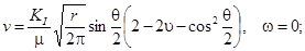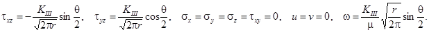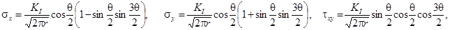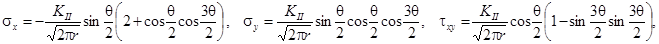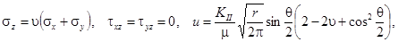 Эти формулы были получены для случая плоской деформации; в случае плоского напряженного состояния нужно взять в них sz=0 и заменить n на n/(1+n). Формулы справедливы в малой окрестности края трещины, т.е. r должно быть малым по сравнению с характерным линейным размером тела, например, длиной трещины или расстоянием ее конца от свободной границы.