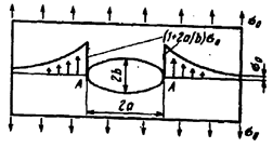 Дальнейшим развитием является анализ напряжений вокруг овального отверстия в пластине в случае растяжения, чистого изгиба, чистого сдвига (Г.В.Колосов, 1910 г., К.Инглис, 1913 г.), в соответствии с которым в вершине отверстия возникает напряжение (рис. 39)
