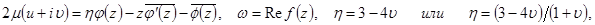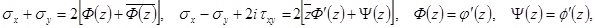 Допустим, что поле упругих смещений и деформаций не зависит от одной из прямоугольных декартовых координат x, y, z, например, от z. В этом весьма общем и важном случае все смещения и напряжения можно представить через функции Ф(z), Y(z) и f(z), являющиеся аналитическими функциями комплексного переменного z=x+iy в области, занятой телом. Первые две из них часто называют потенциалом Колосова-Мусхелишвили. Выражения для комплексного представления смещений и напряжений имеют следующий вид
