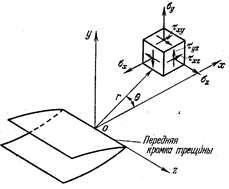 Рис. 40. Система координат и компоненты напряжений у кончика трещины