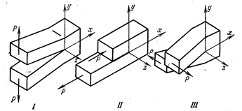 Общее корректное решение зависит от трех действительных параметров, которые участвуют в решении на основе потенциалов Колосова-Мусхелишвили в качестве множителей при различных членах асимптотики и которые определяются из решения задачи. Каждый из указанных трех членов асимптотического разложения соответствует одному из трех основных типов трещин (рис. 41).