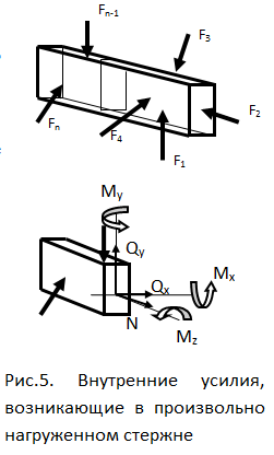 Таким образом, введя понятие внутренних усилий можно свести все многообразие внешних нагрузок к 6-ти силовым факторам и представить даже самое сложное внешнее воздействие как сочетание 4-х видов сопротивления: растяжение-сжатие, сдвиг, кручение, изгиб.