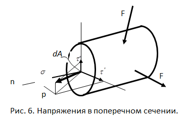 Полное напряжение р может быть разложено на три составляющие по нормали к плоскости сечения и по двум осям в плоскости сечения (рис.6). Проекция полного напряжения на нормаль к сечению обозначается