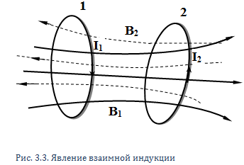 Рассмотрим два контура 1 и 2, расположенные близко друг от друга (рис. 3.3). Пусть в контуре 1 течет ток I1. Он создает магнитный поток, пронизывающий контур 2 и пропорциональный величине самого тока I1: