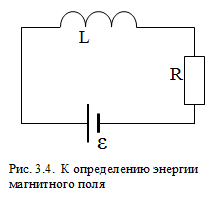 Для определения энергии магнитного поля рассмотрим контур, состоящий из источника э.д.с. - ε, катушки индуктивности - L и сопротивления - R (рис.3.4). При замыкании цепи ток возрастает от 0 до I, и, следовательно, возникает э.д.с. самоиндукции εis, направленная против э.д.с. ε, возбуждающей ток. При размыкании цепи сила тока уменьшается от I до 0, что вызывает появление э.д.с. самоиндукции εis того же направления, что и направление внешней ε. Можно предположить, что на увеличение тока в контуре затрачивается дополнительная работа, идущая на создание энергии магнитного поля. При снижении тока эта энергия выделяется в виде дополнительного джоуль-ленцева тепла.