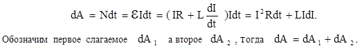 Первое слагаемое dA1 = I2Rdt – это работа, расходуемая на нагревание проводника, т.е. тепло, выделяемое в проводнике за время dt. Второе слагаемое dA2 = LIdI – работа, обусловленная индукционными явлениями. Данная дополнительная работа, затрачиваемая на увеличение силы тока в контуре от 0 до I, находится как интеграл: