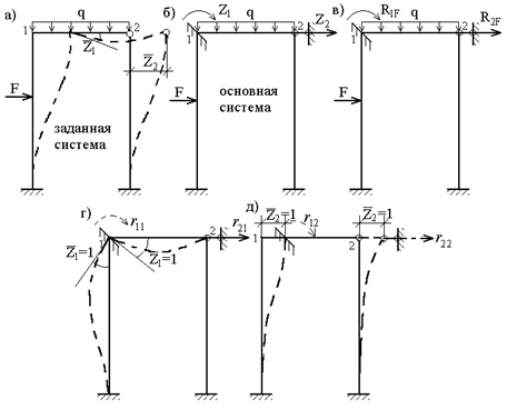 Второй индекс у обозначений реакций указывает на то воздействие, которое является причиной появления реакции, т.е. R1F – реактивный момент во введенной заделке от действия внешней нагрузки (рис.54,в); R11 – реактивный момент во введенной заделке от поворота этой же заделки на угол Z1; R12 – реактивный момент во введенной заделке от линейного смещения узлов 1 и 2 на величину Z2.