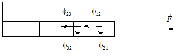 Разобьем стержень на элементы плоскостями перпендикулярными оси сжатия. Внешняя сила действует только на элемент 1, так как есть сила то и должно быть ускорение, значит 1 будет двигаться равноускоренно. Но элемент 1 взаимодействует с элементом 2 посредством силы притяжения, препятствующей движению элемента 1. Движение элемента 1 будет продолжаться до тех пор, пока внешняя сила не уравновесится силой j 12. Эти силы называются силами упругости. Остальные элементы друг за другом приходят в движение и деформироваться продолжают до тех пор, пока не установится некое статическое состояние, при котором каждый слой остается неподвижным, но испытывающим действие упругих сил со стороны соседних слоев. Тело будет деформировано и находится в напряженном состоянии. Различные части деформированного тела взаимодействуют между собой через поверхность раздела, вдоль которой они граничат.