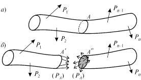 Если рассечь брус сечением А на две части и правую отбросить, то, т.к. связи между частями тела устранены, необходимо действие правой (отброшенной) части на левую заменить некоей системой внутренних сил (PА ), действующей в сечении А (рис. 1.2, б).