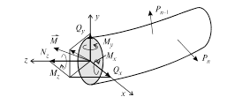 Составляющая Nz называется нормальной, или продольной силой в сечении. Силы Qx и Qy называются поперечными усилиями. Момент Mz называется крутящим моментом, а моменты Mx и My -изгибающими моментами относительно осей x и y, соответственно.