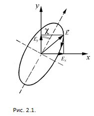 В общем случае радиоизлучение может содержать две компоненты – неполяризованную и поляризованную. При распространении излучения конец мгновенного вектора электрического поля волны, измеренного в некоторой фиксированной точке пространства, описывает эллипс (рис. 2.1). Выберем систему координат, ось z которой направлена вдоль волнового вектора (то есть, совпадает с направлением распространения, перпендикулярным плоскости рис. 2.1), а оси x и y лежат в плоскости рисунка. Компоненты вектора