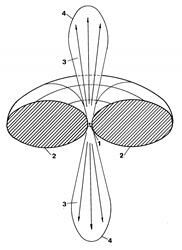 Рис. 5.16. Структура биполярного истечения из молодой звезды: 1 – звезда, 2 – околозвездный диск, 3 – поток ускоренного молекулярного газа, 4 – ударная волна.