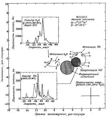Мазеры OH и H2O в областях звездообразования. Линии гидроксила 18 см впервые были зарегистрированы в эмиссии в 1965 г. Их свойства оказались столь необычны, что они заслужили название "мистериум". Излучение исходило из окрестностей зон HII вокруг молодых горячих звезд. Профиль линий имел сложную многокомпонентную форму. Интерферометрические наблюдения показали, что каждый пик в профиле излучается отдельным источником ("горячим пятном", мазерной конденсацией) размером от 1 до 10 а.е. (рис. 5.17). Потоки мазерных эмиссионных деталей достигали тысяч Ян при очень малой ширине профиля (0.6–3 кГц).