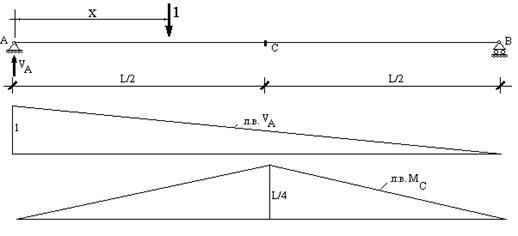 Если единичная сила находится на расстоянии х от левой опоры, то реакция в последней будет составлять