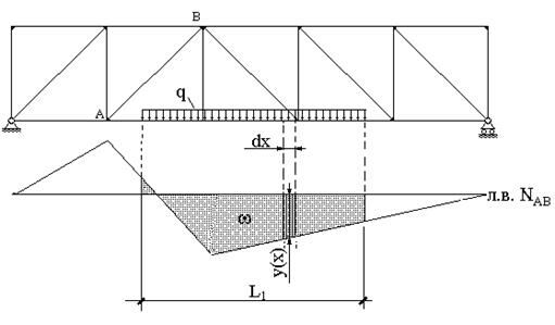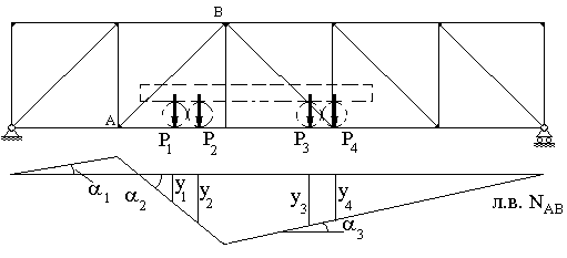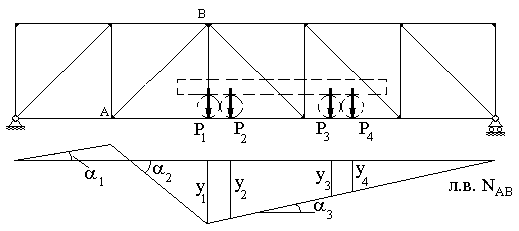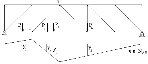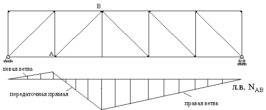 такую, что ни одна из сил, приложенных к системе, не перейдет при этом через какую-либо вершину линии влияния и не выйдет за пределы фермы, усилие в стержне АВ составит: