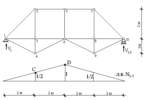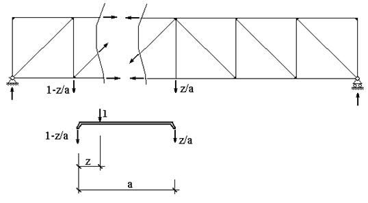 Построим линию влияния для стержня фермы 2-3[3]. Для этого достаточно определить усилие в этом стержне при различных положениях единичной силы на ездовой линии.