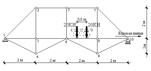 2. Определить максимальное и минимальное усилия в стержне фермы 2-3 при движении по ездовой линии (по горизонтали от узла 1 к узлу 10) системы из двух сил (рис.51).
