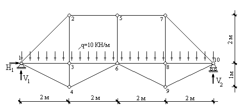 3. Определить усилие от постоянной равномерно распределенной нагрузки q=10КН/м, приложенной к поясу фермы, совпадающему с ездовой линией (рис.52).