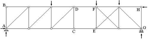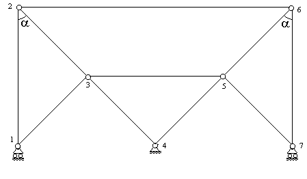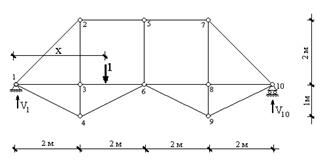 . Условие (1) выполняется: 10=7×2-4=10. Сделать вывод о ее геометрической неизменяемости на основе структурного анализа не удается, поэтому приходится пользоваться статическим методом анализа геометрической неизменяемости фермы, т.е. проанализировать возможность существования самоуравновешенной системы усилий в ее стержнях при отстутсвии внешней нагрузки.