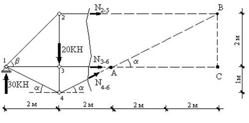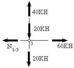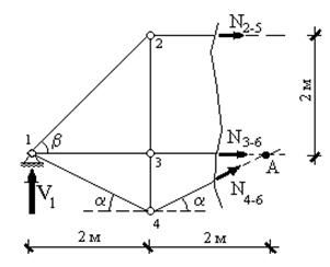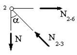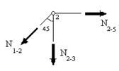 Предположим, что в стержне 1-2 возникло растягивающее усилие N1-2=N. Рассмотрим равновесие узла 2 (рис.26). Составим для него уравнения проекций действующих на узел усилий на вертикальную и горизонтальную оси: