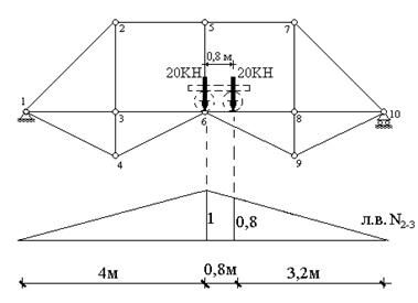 Построенная линия влияния не имеет отрицательных ординат, следовательно, при любом положении системы сил на ездовой линии в стержне будут возникать только растягивающие усилия. Поэтому, максимальным возможным усилием в стержне 2-3 для рассматриваемой подвижной нагрузки является 36КН, минимальным -0 КН.
