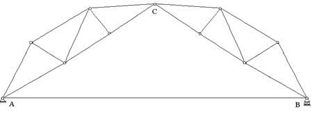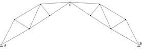 . Условие (1) выполняется: 18=11×2-4=18. Эта ферма также образована двумя жесткими дисками (простейшими фермами). Они соединяются между собой шарниром С, т.е., на первый взгляд, только двумя связями, т.к. шарнир препятствует взаимному смещению соединяемых им узлов в вертикальном и горизонтальном направлениях. Однако, поскольку опоры А и В неподвижны, взаимных горизонтальных смещений точек А и В быть не может. Значит, роль третьей связи играет основание. Поэтому рассматриваемая система геометрически неизменяема, а в обеих опорах возникнут горизонтальные распорные реакции.