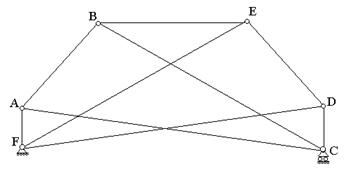 Ферма образована двумя шарнирными треугольниками ABC и DEF, связанными между собой тремя связями- AF, BE, и DC, линии действия которых не параллельны и не пересекаются в одной точке. Прикрепление образованного в результате жесткого диска к основанию выполнено при помощи одной неподвижной и одной катковой опоры, т.е. также при помощи трех связей, линии действия которых не параллельны и не пересекаются в одной точке. Следовательно, ферма геометрически неизменяема.