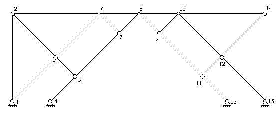 Из рассмотрения узлов 5 и 7, согласно признаку 2 нулевых стержней следует, что стержени 3-5 и 7-6 - нулевые. Далее, из рассмотрения узла 3, согласно признакам 4 и 2 следует, что стержень 2-3 нулевой. Далее, из рассмотрения узла 2, согласно признакам 4 и 1 следует, что стержни 1-2 и 2-6 - нулевые. Далее, из рассмотрения узла 6, согласно признакам 4 и 2 следует, что стержень 3-6 нулевой, а значит, в соответствии с признаком 5, нулевым будет и стержень 6-8. Далее, из рассмотрения узла 3, согласно признаку 5 следует, что стержень 1-3 нулевой. Аналогично доказывается, что соответствующие стержни на правой стороне фермы, а именно стержни 8-10, 10-14, 14-15, 9-10, 11-12, 12-14, 10-12 и 12-15 тоже будут нулевыми. Рассмотрим теперь узел 8. В соответствии с признаками 4 и 1 стержень 7-8 будет нулевым. Далее, последовательно рассматривая узлы 7 и 5, пользуясь признаком 5, докажем, что стержни 5-7 и 4-5 - нулевые. Аналогично доказывается, что соответствующие стержни на правой стороне фермы, а именно 8-9, 9-11,11-13, тоже будут нулевыми. Итак, нам удалось доказать, что все стержни фермы при отсутствии нагрузки являются нулевыми. Следовательно, в этом случае в них не может возникнуть ненулевые усилия, а значит ферма геометрически неизменяема.