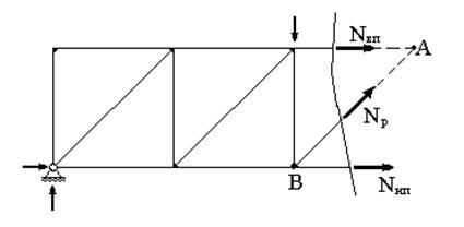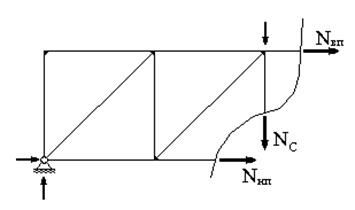 Как и при изгибе балки на двух опорах под действием нагрузки, направленной вниз, стержни верхнего пояса балочной фермы будут сжатыми, а нижнего - растянутыми. В консольной ферме (рис.7) ситуация будет обратной.