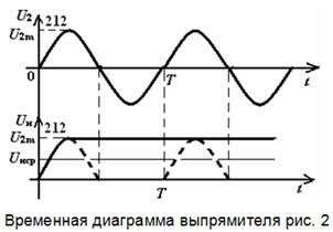 Определить среднее значение выпрямленного напряжения Uнср, Iнср, Uобр макс, коэффициент пульсаций р, построить временные диаграммы.