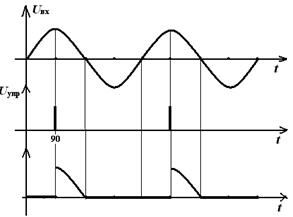 Однофазный двухполупериодный управляемый выпрямитель имеет на входе напряжение 150В. Построить временную диаграмму, при угле регулирования 90 градусов. Построить регулировочную характеристику выпрямителя.