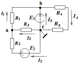 Дано: R1 ÷ R5 =10 Ом, Е1 = 30 В, Е2 = 60 В Ток в любой ветви схемы можно найти по обобщённому закону Ома. Для этого необходимо определить потенциалы узлов схемы. Заземлим любой узел схемы φс = 0, тогда потенциал узла b равен значению E1