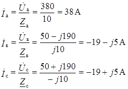 | Дано: обрыв нейтрального провода Uл = 380 В Zа = 10 Ом Zв = j10 Ом Zс = -j10 Ом Определить токи в фазах приёмника |